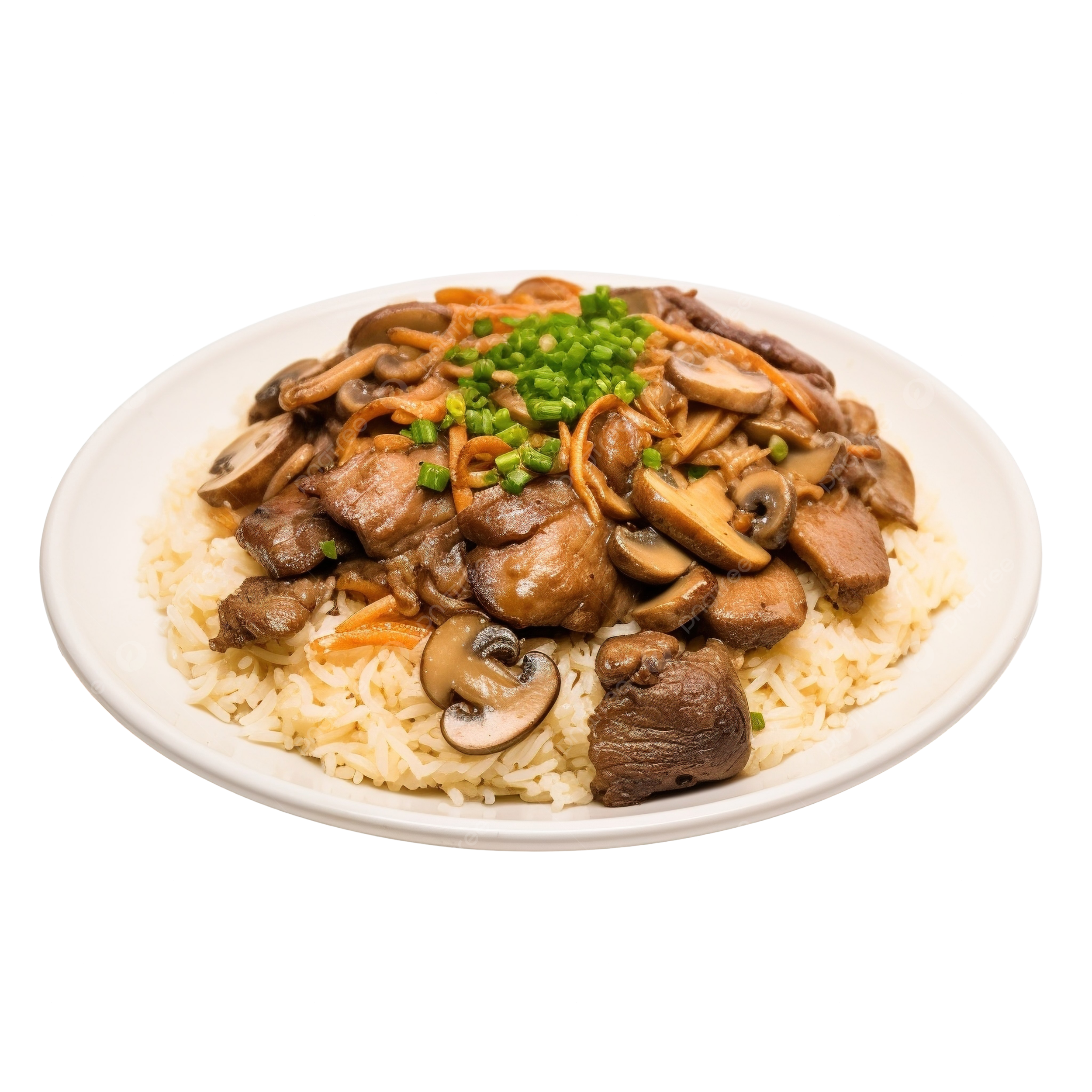 A flavorful dish of stir-fried rice cooked with mushroom, fresh vegetables, and a blend of savory sauces and aromatic spices.